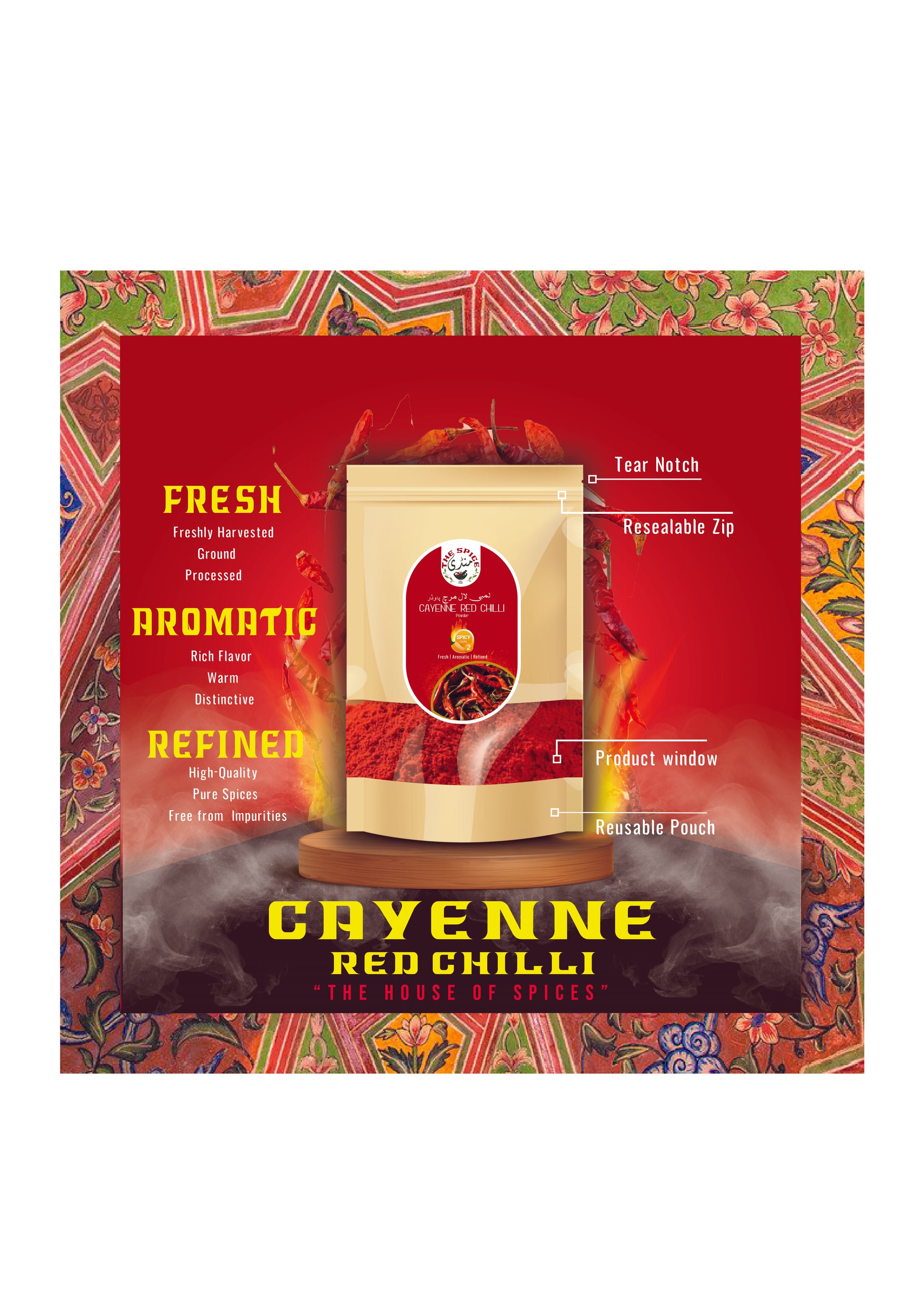 Packaged in an environmentally friendly, resealable stand-up pouch, it ensures freshness, aroma, and convenience in every use. Elevate your cooking with the authentic heat of Cayenne Red Chilli Powder—a must-have for spice enthusiasts.
